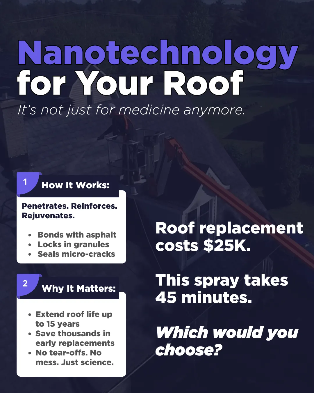 GoNano is a protective nano-coating that penetrates your roof and helps prevent water damage, buildup, and early wear. It’s designed to extend the life of your roof and reduce the need for costly repairs or replacement.
